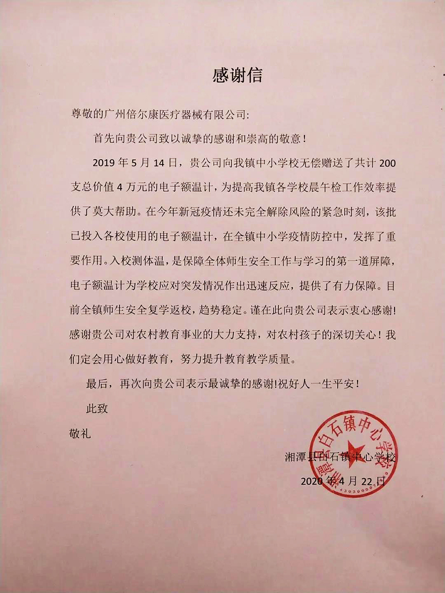 不知道朋友們還記得嗎?在2019年的5月份,倍爾康曾為湖南湘潭市白石鎮(zhèn)的鄉(xiāng)村學(xué)校捐贈了200支非接觸式紅外線體溫計,當(dāng)初捐贈的目的是為助力鄉(xiāng)村學(xué)校的疾病防控以及晨間檢查工作。