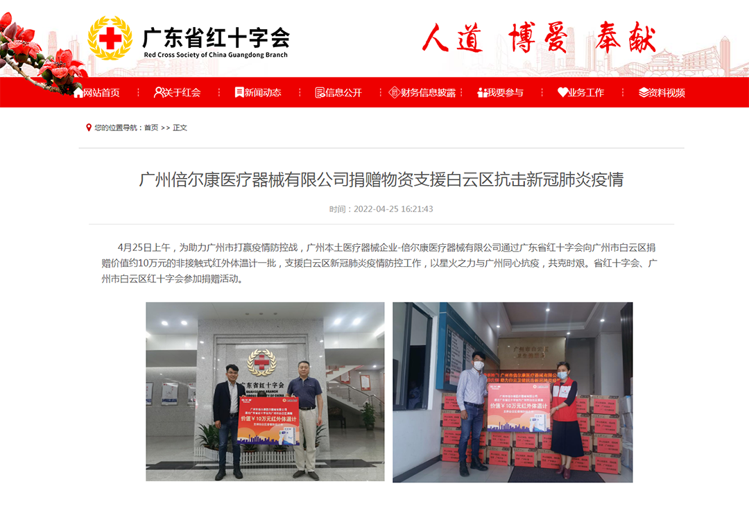 廣東省紅十字會也在其官網(wǎng)報道了倍爾康捐贈體溫計的消息,并感謝倍爾康的愛心捐贈以及高度肯定了倍爾康的社會責(zé)任感。